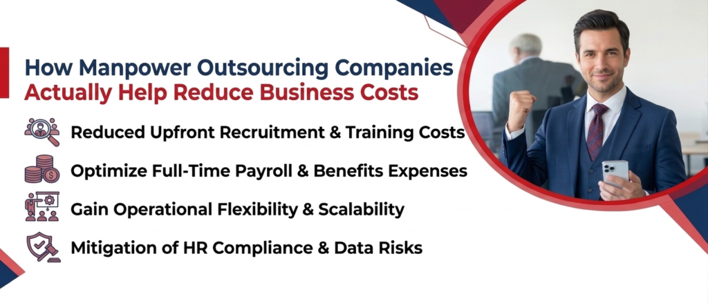 A Manpower Outsourcing Company helps by removing some of the heavier, ongoing costs — hiring, training, HR management, and employee-related expenses.